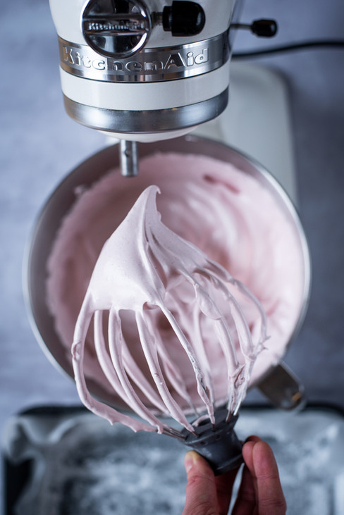Jakmile tahle javorová směs dosáhne teploty 114°C, vložte nádobu se želatinovou směsí pod balónový nástavec mixéru, lehce promíchejte a začněte přilívat za chodu mixéru javorovou směs. Jakmile do nádoby vlijete celý její obsah, zvyšte rychlost mixéru na nejvyšší rychlost a nechte šlehat zhruba 10 minut. Nepřiklápějte ochranným víkem, je zapotřebí přísun vzduchu, aby mohla směs stydnout v průběhu šlehání.