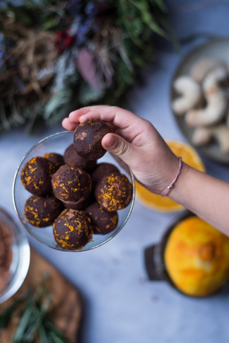 Ingredience: 1 hrnek blanšírovaných mandlí 2 hrnky medjool datlí 2 lžíce mandlového másla 2 lžíce raw kakaového prášku 2 lžíce chia semínek 2 lžíce kvalitního kokosového oleje 2 lžíce šťávy z pomeranče kůra z 1 bio pomeranče 1-2 snítky čerstvého rozmarýnu špetka skořice a vanilkového prášku Na obalení: raw kakaový prášek, kůra z 1 bio pomeranče
