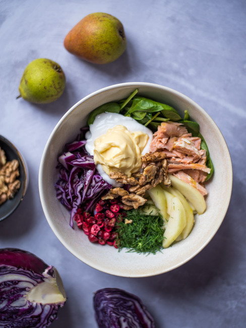 Zrovna je sezóna červeného zelí v plném proudu. Takže proč mu nedat prostor hned v hlavní roli :) Salát je inspirovaný waldorfským - jablko, řapíkatý celer, oříšky, majonéza. Ale já si ho trochu pozměnila a chuťově doupravila.. Ze salátu je jednak skvělá příloha, ale zároveň se z něho dá snadno zkompletovat hlavní jídlo. Ladí jak s divokým lososem, tak s pečeným kuřetem.